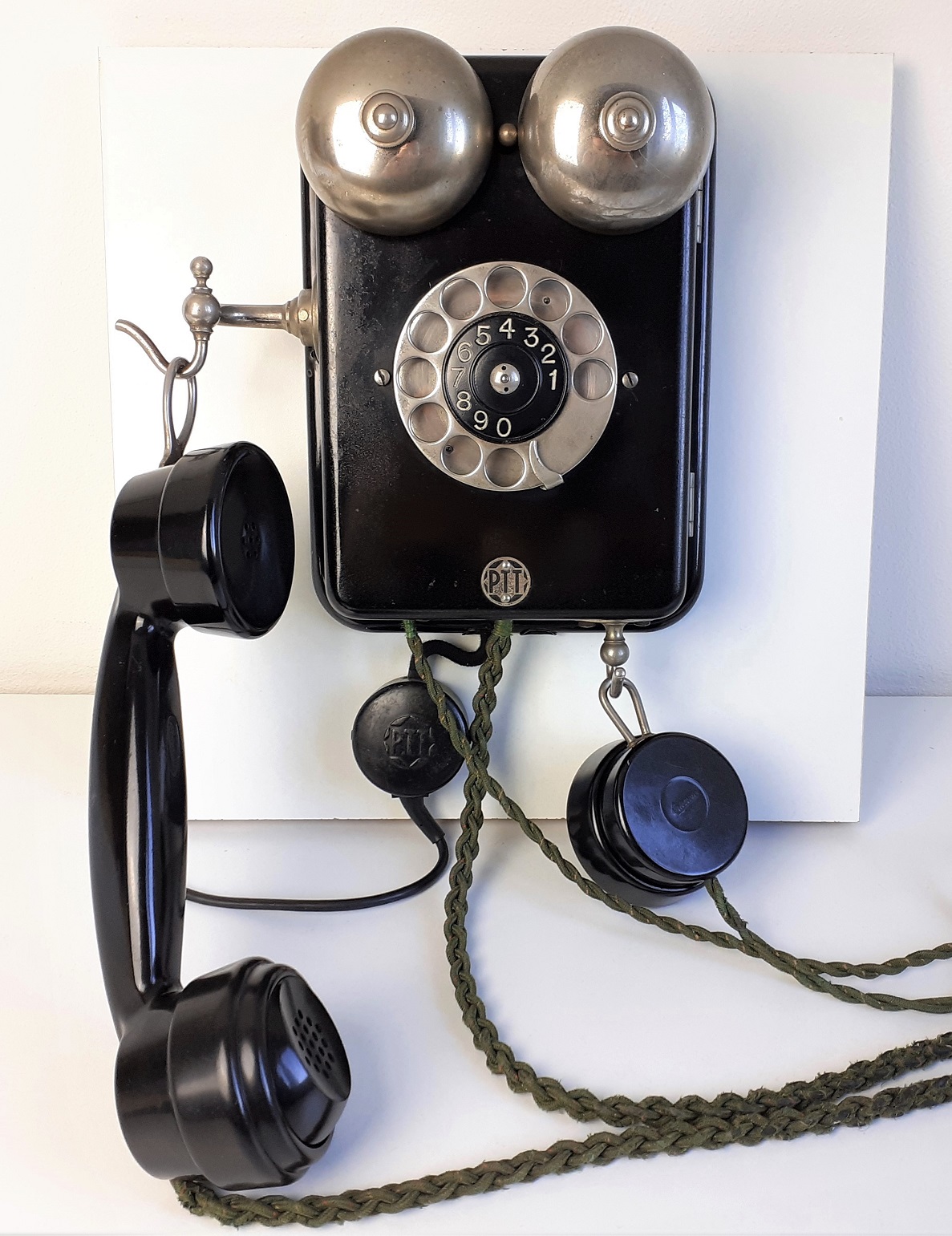 Metalen wandtoestel Ericsson DE100 met extra telefoon (telefoondienst Rotterdam), in 1941 door PTT gecontroleerd en voorzien van nieuwe bakelieten hoorn en extra telefoon.