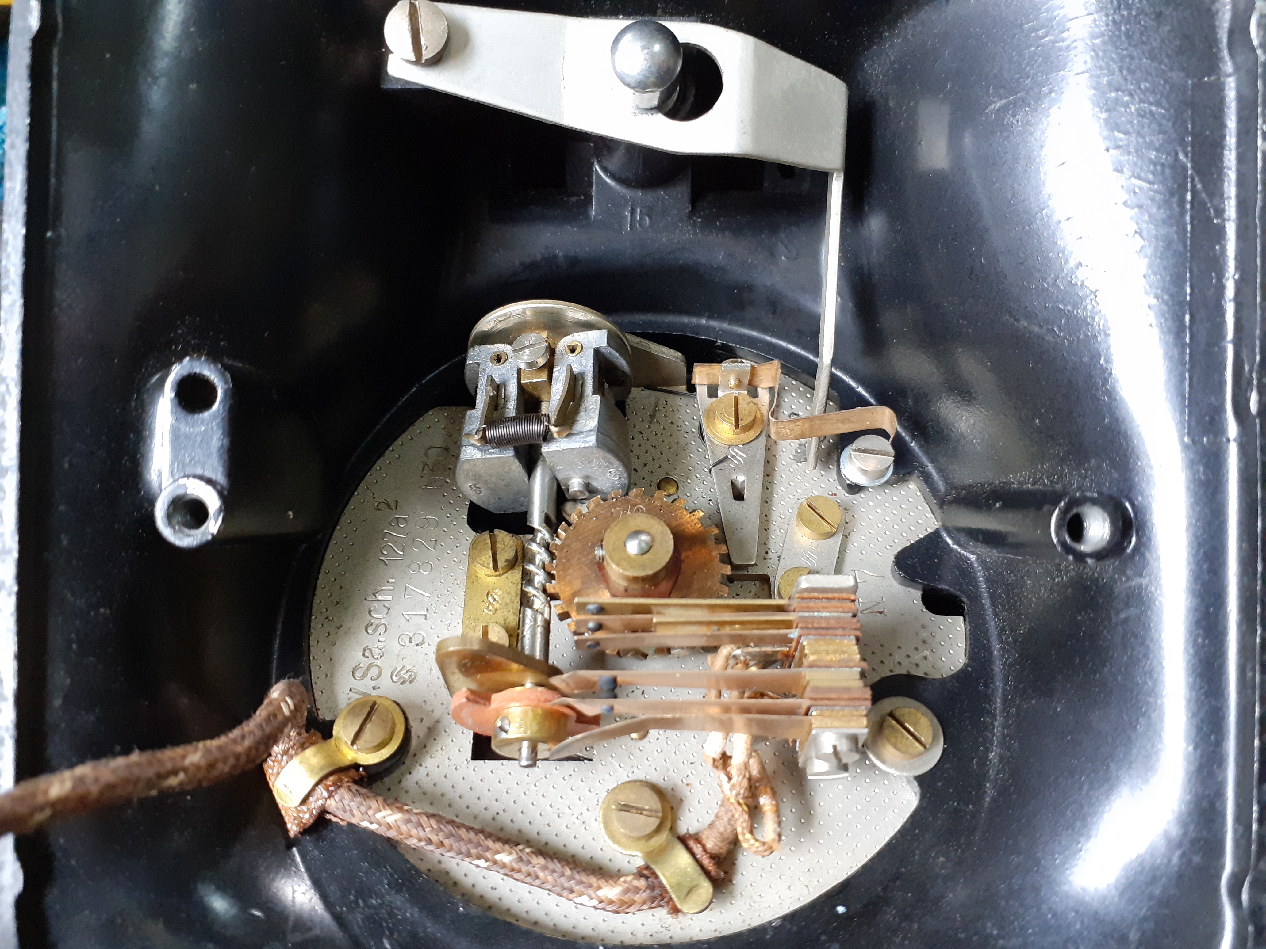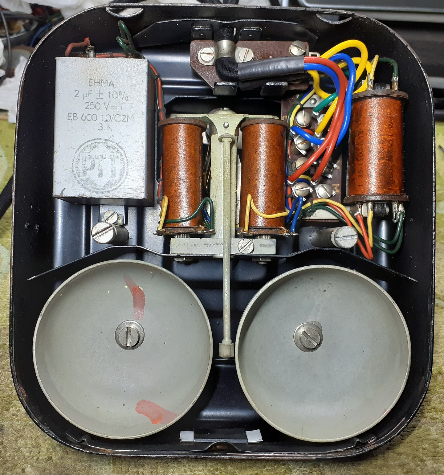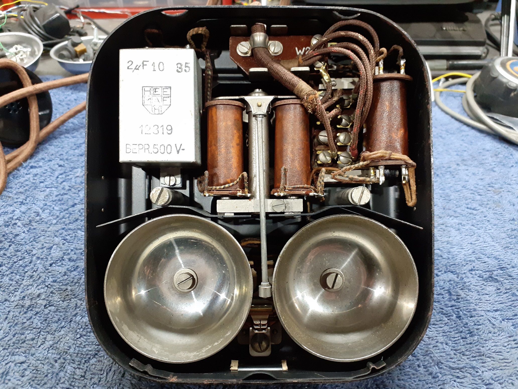 Hieronder het binnenwerk van dit exemplaar, let ook op de belcondensator van 2 μF, in Norm ’51 was dit 1 μF. Ook de draadkleuren wijken hier en daar af van de latere Norm ’51.