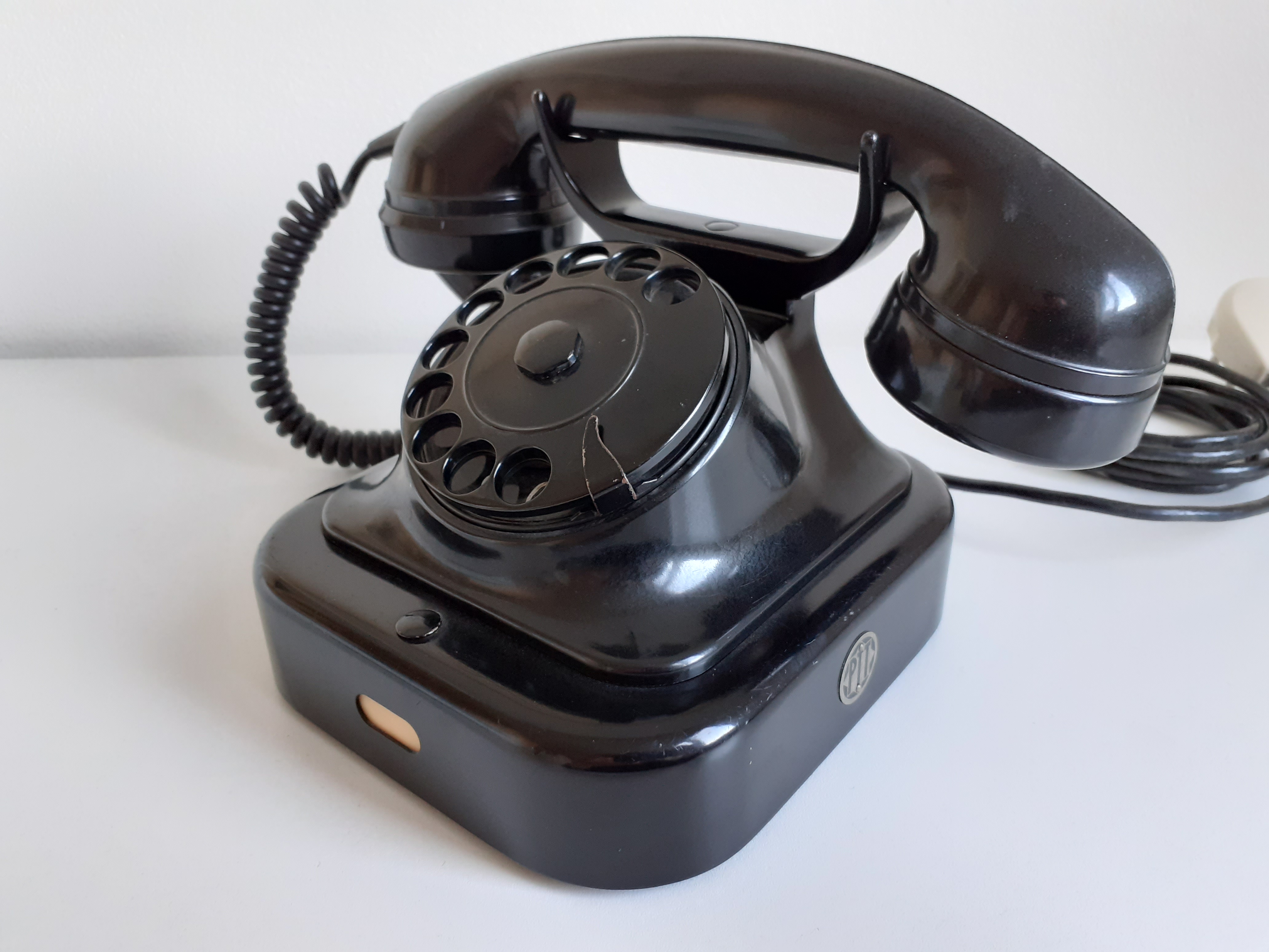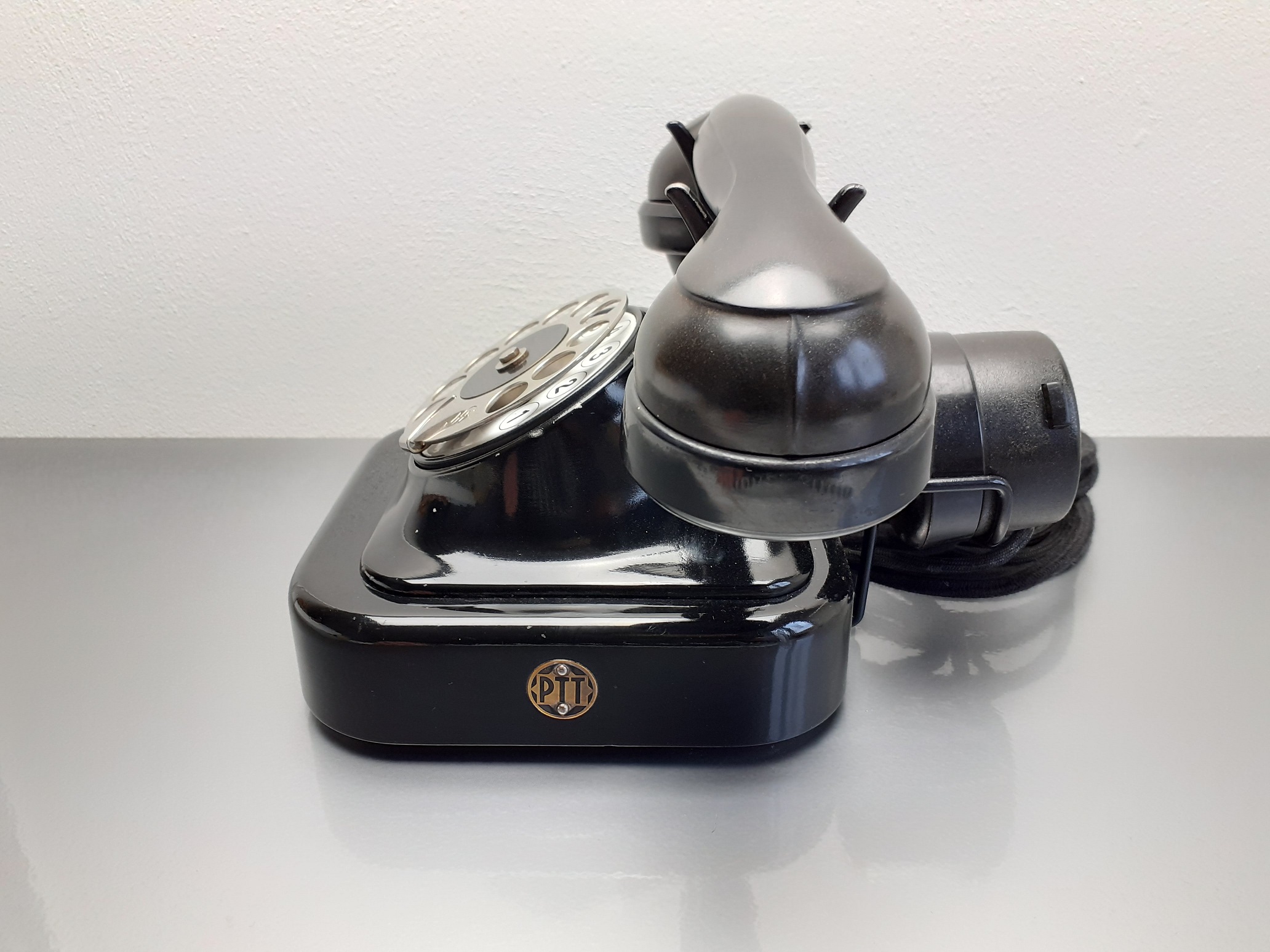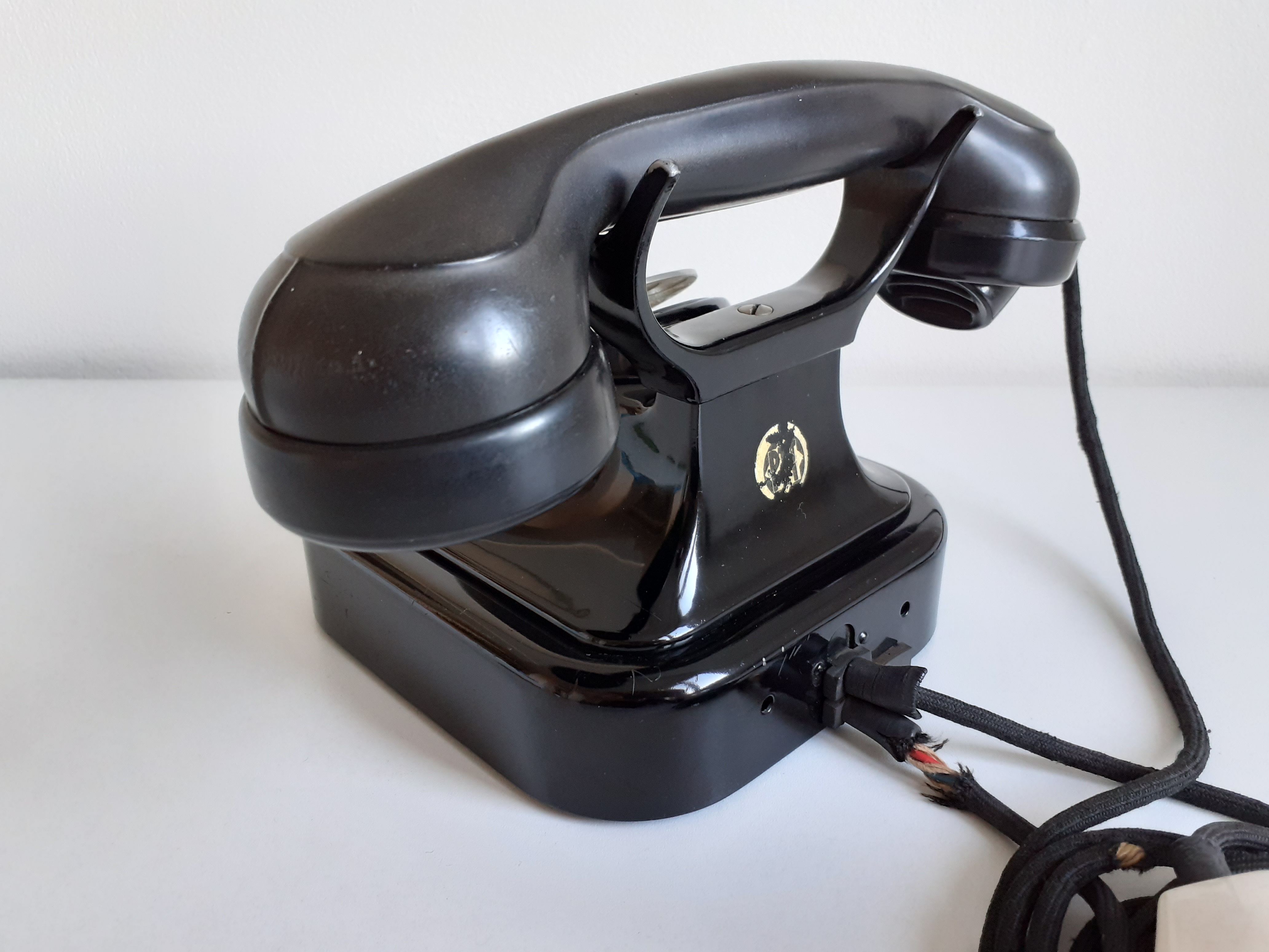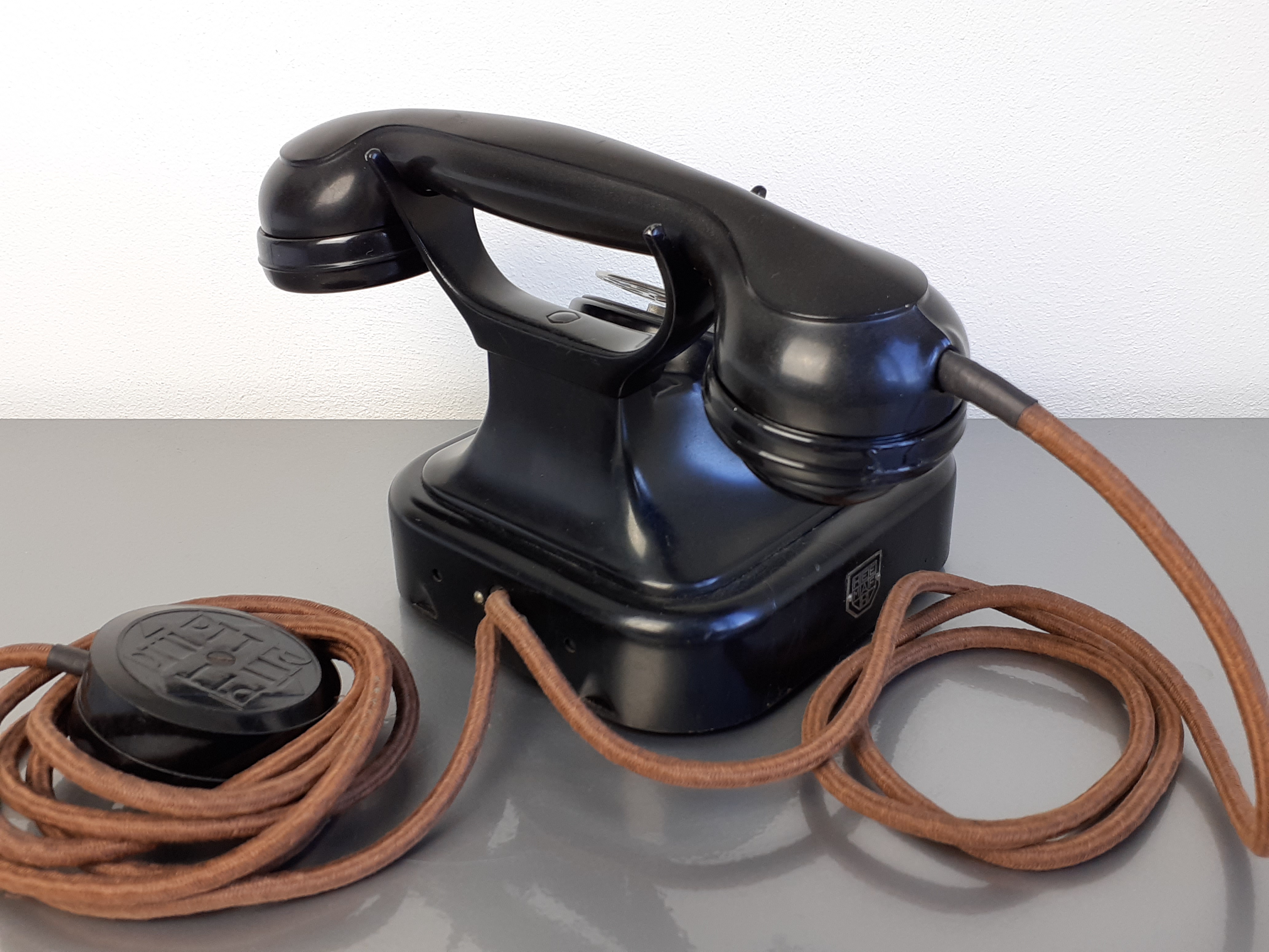 Het toestel in figuur 1 is een mooi bewaard gebleven exemplaar uit 1935, in geheel originele toestand. Het toestel heeft aan de rechterzijkant een schildje met het toenmalige beeldmerk van de Rijkstelefoondienst, zoals te zien in figuur 2.