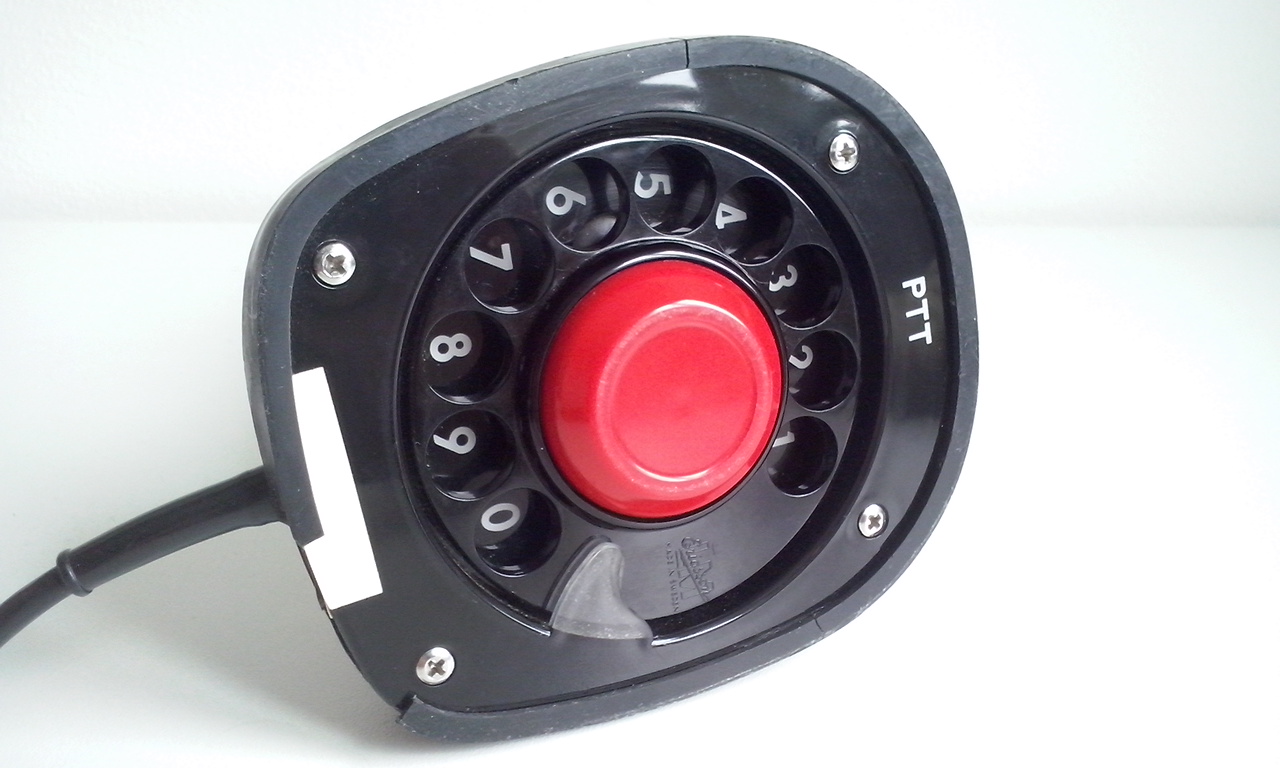 Goed, weer terug naar de Ericofoon. De kiesschijf met het ingebouwde haakcontact (de rode knop) zit aan de onderzijde. Uniek voor de PTT-versie is de zwarte onderzijde, die was bij alle andere uitvoeringen crème van kleur. Het aansluitsnoer is zwart en heeft een recht en gekruld gedeelte. Het tijdens een gesprek neerzetten van het toestel leidde vaak tot het onbedoeld beëindigen van de conversatie. Dat zal voor veel gebruikers even wennen zijn geweest.